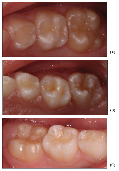 El diagnóstico clínico de lesiones de fluorosis dental en la dentición decidua es importante, ya que puede considerarse como un indicador para el desarrollo de futuras lesiones en la dentición permanente. No obstante, algunos odontólogos subestiman este tipo de lesiones por el desconocimiento de los signos clínicos de dicha patología durante los primeros años de vida. Según Ruan et al. 17, la presencia de este tipo de lesiones durante los primeros años de vida podría estimarse como un biomarcador de exposición a fuentes de flúor. Por lo tanto, para el diagnóstico de la fluorosis dental es esencial la evaluación clínica, en la que se debe considerar: localización de la lesión (generalmente en el tercio cervical y cúspide), extensión (presente en un tercio o en toda la superficie, dependiendo de la severidad), color (principalmente de color blanco o aspecto amarillento por pigmentos extrínsecos), aspecto (esmalte hipomineralizado y moteado con presencia de lineas horizontales divergente y en dientes homólogos) 6 (ver figura 1 (A,B y C)). Además, es importante realizar diagnóstico diferencial con otro tipo de lesiones en esmalte y dentina, como manchas blancas por caries dental (White Spot Lesions), amelogénesis y dentinogénesis imperfecta e hipomineralización molar-incisiva 6.