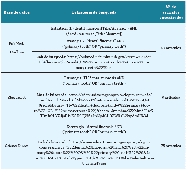 Las búsquedas primarias fueron conducidas por dos investigadores previamente estandarizados, por medio de capacitaciones sobre búsqueda de bibliografía en salud y revisión de la literatura, en las bases de datos PubMed/Medline, EbscoHost y ScienceDirect en noviembre de 2020. Los descriptores considerados para las estrategias de búsqueda fueron "Dental fluorosis", "deciduous teeth", "Primary teeth" y "Primary tooth" en conjunto con los conectores booleanos "OR" y "AND". Además, se realizó una búsqueda complementaria en literatura gris (Google Académico). Las estrategias utilizadas en cada base de datos y el número de artículos encontrados son presentan en la tabla 1. Como criterios de inclusión se consideraron para la revisión de literatura artículos disponibles en idioma inglés, español y portugués en texto completo, publicados entre 20002020, independientemente del diseño metodológico utilizado. Además, estudios que abordaran los ítems que se iban a discutir: etiología y factores relacionados, reporte de prevalencia, diagnóstico o tratamiento de la fluorosis dental en niños entre 1- 5 años.