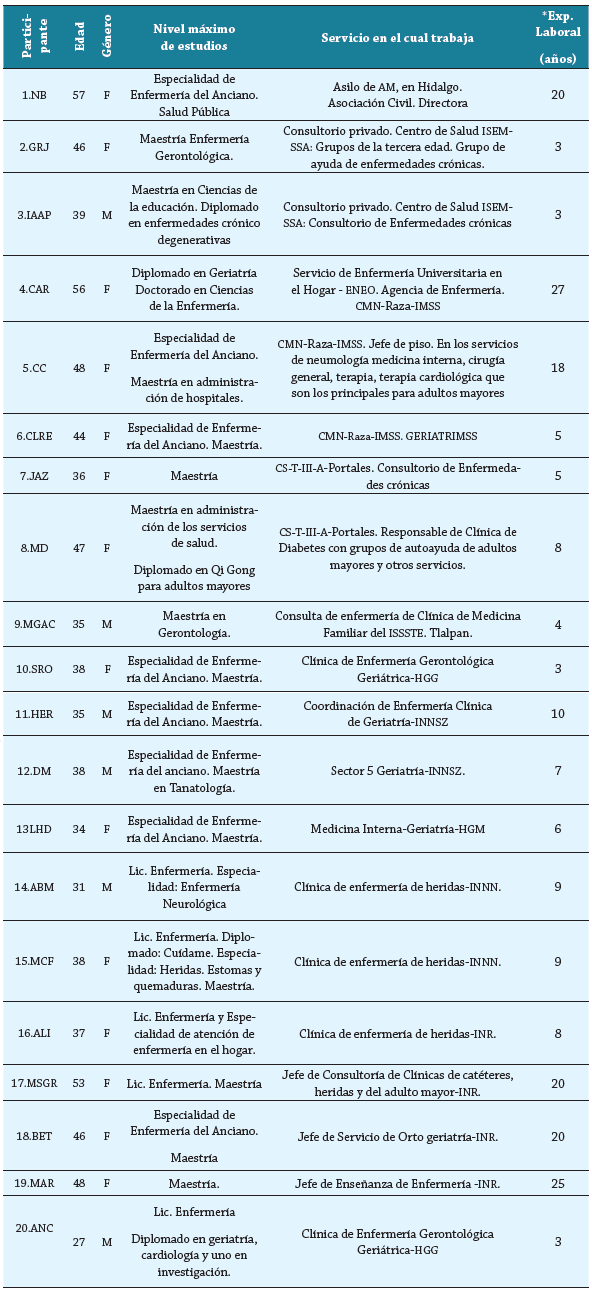 Participaron 14 enfermeras y 6 enfermeros entre 28 y 57 años, laboran en primero y tercer nivel de atención en áreas especializadas de geriatría, dos con práctica independiente y asistencial (tabla 1).