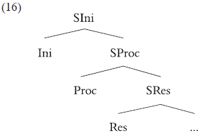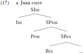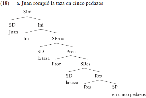 Es decir, lo que en otros modelos es un único verbo léxico o la combinación de una raíz con un categorizador verbal, es en esta propuesta un conjunto formado por tres proyecciones, cada una de ellas correspondiente a un subevento aspectual. Proc(eso) es el núcleo que aporta una variable eventiva davidsoniana (e) y por ello define la parte dinámica de un evento, indicando el desarrollo que se sigue en su duración. Bajo él, cuando el verbo define sintácticamente un estado subsiguiente, hay una proyección estativa, Res(ultado), que define la situación que se alcanza una vez que culminan algunos procesos télicos. La tercera proyección es Ini(ciación) y define el componente causativo del evento. La presencia o ausencia de estas tres proyecciones define los tipos aspectuales básicos. Una actividad causativa -es decir, un evento que contiene un componente de causación y un desarrollo eventivo- corresponde a la estructura de (17). Un cambio de estado con un resultado y un componente causativo, como romper, corresponde a (18):