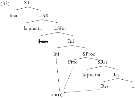 La propuesta de Ramchand, y otros autores que trabajan en este modelo, es que, como condición previa a la lexicalización de (32), deben evacuarse del constituyente sintáctico los elementos que no forman parte de los rasgos de la pieza. El movimiento de los argumentos no constituye ni un problema ni un cambio con respecto a lo que normalmente se asume para la estructura verbal. El argumento externo se desplaza a una posición de caso superior al verbo (ST) y, de forma semejante, el argumento interno se mueve a una posición de caso acusativo. En su lugar dejan copias que, como suele suceder, se ignoran al lexicalizar. Este movimiento de caso, necesario independientemente por las propiedades de los argumentos, libera el constituyente de los elementos no incluidos en la lexicalización: