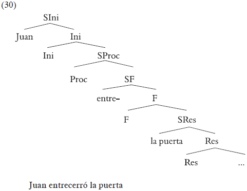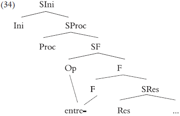 Dada la estructura de (30), esperaríamos que entre- no apareciera como un prefijo, porque no se encuentra a la izquierda de la proyección verbal más alta, que es SIni. Suponiendo que el verbo se forma mediante movimiento de núcleo (Res+Proc+Ini) y se materializara en Ini, esperaríamos que entre- emergiera como un complemento o como un sufijo, dando lugar a (31), que es agramatical: