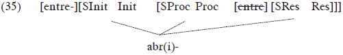 (34) no puede lexicalizarse como un verbo, porque contiene un constituyente que se manifiesta léxicamente como entre. La propuesta es que en tales casos debe producirse un movimiento de evacuación morfofonológico en el que el exponente se reordena, desplazándose a una posición más alta, para permitir la lexicalización del constituyente verbal. Este movimiento se produce en la interfaz fonológica, y por lo tanto no altera el alcance semántico del operador. Una vez que se produce (35), el constituyente verbal queda libre para lexicalizarse como abr(i)-: