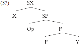 Es decir, todo elemento que sea modificador de un morfema debe convertirse en un prefijo. La razón es que, como modificador, debe responder a una estructura como (37), donde Op es el modificador: