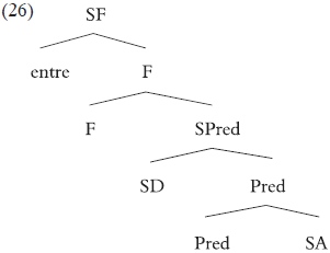 Asumiendo que el movimiento siempre se produce a una posición más alta dentro de una estructura, la consecuencia es que el elemento se convertirá en un prefijo -a la izquierda de la base- y no en un sufijo. Este es el resultado correcto. Por tanto, nuestra propuesta deriva que entre, como modificador aspectual -incluso del aspecto resultante-, debe funcionar como un prefijo: es un modificador de un elemento interno al verbo, y como tal debe evacuar el constituyente verbal para permitir su lexicalización.