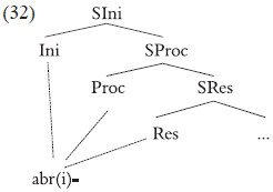 En el modelo de Ramchand (2008), un único morfema puede materializar una serie de núcleos, es decir, un sintagma o un constituyente complejo. Específicamente, lo que Ramchand propone es que un morfema como abr(i)- lexicaliza el constituyente verbal completo, como en (32):