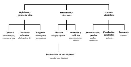 Como se indicó más arriba, los verbos que se mantuvieron, por inscribirse en el posicionamiento, son verbos que indican un compromiso fuerte del autor, ya sea que se trate de verbos de opinión o de evaluación, o de verbos que indican un aporte único del autor en la demostración o el descubrimiento científico. No se integraron entonces aquí los verbos de funcionamiento puramente metadiscursivos (presentaremos, terminamos por...) o que remiten a la narración científica (realizamos 23 encuestas, analizamos los resultados...). En vista de que los verbos son fuertemente polisémicos y muy desemantizados, como en el caso de los verbos de apoyo (por ejemplo, formular una hipótesis, hacer una elección), se mantuvo toda la expresión verbal. Extrajimos empíricamente, a partir de observaciones en el corpus, tres grandes clases de verbos de posicionamiento: