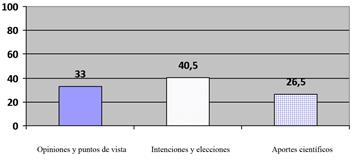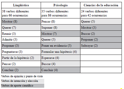 sorprendente en una disciplina en la que la experimentación tiene un rol central. Se observa en los lingüistas una distribución más equilibrada de los tipos de verbos utilizados mientras que en ciencias de la educación, los verbos que expresan una opinión son poco frecuentes (ninguno aparece en más de una ocurrencia), lo que puede parecer sorprendente en una disciplina de las ciencias humanas a menudo atravesada por debates polémicos.