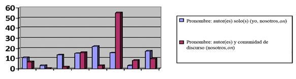 La presencia, para nada despreciable, del yo en lingüística para los artículos individuales también es subrayada por Fløttum et al. (2006) quienes reconocen una proporción netamente más importante que en economía. Nuestras observaciones se relacionan también con las de Poudat y Loiseau (2005) quienes, comparando la proporción del pronombre yo en filosofía y lingüística, identifican igualmente una presencia masiva de yo en lingüística en relación con la filosofía. Rinck (2006) identifica cifras comparables con las nuestras: el yo es usado en 6 artículos de 20.