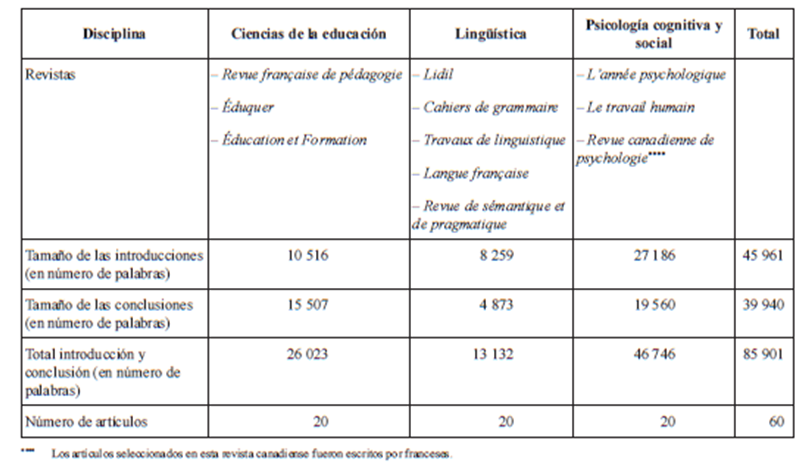 Cuando los artículos no presentaban secciones claramente identificadas con los términos «introducción» o «conclusión», consideramos como tales a todas las primeras y últimas partes del texto. En la tabla 1 se observan grandes disparidades en cuanto al volumen de las secciones. En general, los artículos de psicología son un poco más largos que los de las demás disciplinas y las partes introductorias y de la conclusión son, de forma particular, desarrolladas en el interior. En psicología, los artículos siguen a menudo implícitamente la estructura IMRaD vigente en las ciencias experimentales (Introduction, Materials and Methods, Results and Discussion) y las introducciones o conclusiones pueden integrar respectivamente las partes «Materiales y métodos» o «Discusión». Estas diferencias de volumen se tuvieron obviamente en cuenta en las evaluaciones cuantitativas.