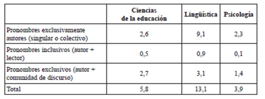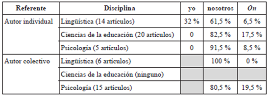Tabla 3 Tipos de pronombres utilizados por los autores para referirse a ellos mismos (en % sobre el número total de pronombres de autores utilizados)