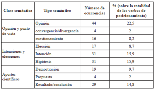 Tabla 4 Distribución de los verbos de posicionamiento que implican al autor (en número de ocurrencias y en porcentaje)