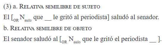 En español existe, además, un tercer tipo de OR, cuyo antecedente no tiene contenido fonológico, pero que sí se encuentra en la estructura sintáctica: las ORs semilibres. Estas oraciones se caracterizan por poseer un antecedente nominal tácito, cuya presencia se evidencia en los rasgos de flexión y de número del determinante. Se ha propuesto -p. ej. Giollo y Muñoz Pérez (2013), y, desde la perspectiva de la morfología distribuida, Kornfeld y Saab (2005) y Saab (2009)- que las ORs semilibres poseen la misma estructura sintáctica que las encabezadas, con la excepción de que en las primeras el elemento que se desplaza a la periferia oracional es un nombre nulo, elemento nuclear listado en el léxico (Panagiotidis, 2003).