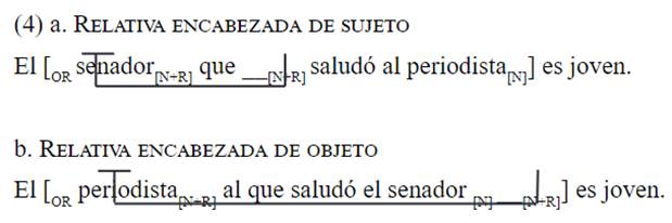 En el caso de las OROs (4b), el restrictor léxico en el sujeto (senador) subordinado interviene en el desplazamiento del antecedente nominal (periodista) desde la posición en la que se interpreta como objeto del verbo subordinado (saludar) hacia la periferia oracional. Entonces, según Friedmann et al. (2009), pero cf. también Grillo (2009), el SN nominal sujeto, al ser estructuralmente similar, interfiere en el establecimiento de la dependencia sintáctica entre filler y gap y en la correcta interpretación de la oración. En cambio, el caso de las ORSs (4a), no hay ningún elemento que interfiera entre filler y gap y el procesamiento se facilita.
