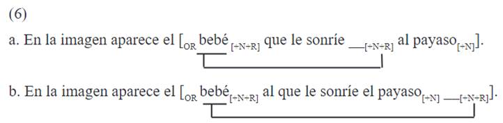 En las OROs semilibres (7b), se da la misma configuración con intervención sintáctica por inclusión de rasgos que en las encabezadas (6b), aunque el restrictor léxico sea un nombre nulo sin contenido fonológico. Respecto a las ORSs semilibres (7a), como no hay ningún elemento interventor entre filler y gap, estas son comprendidas más fácilmente.