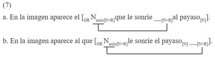 A su vez, existen construcciones en las que la OR modifica a un elemento que no tiene realización fonológica, como ocurre en (2). Estas, conocidas como ORs libres, están formadas por un pronombre relativo, cuyo antecedente se considera nulo (Di Tullio, 2005, p. 312). En este tipo de estructuras es el pronombre relativo el que se desplaza a la periferia oracional.