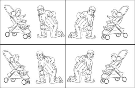 Las 40 imágenes del experimento fueron dibujos en blanco y negro de los 40 eventos en las que también alternaban los roles de los participantes. A su vez, se usaron dos imágenes espejadas de cada una de estas 80 imágenes, sumando un total de 160 estímulos visuales.