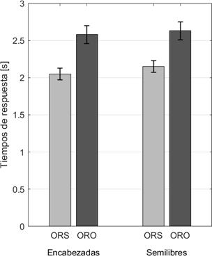El tiempo de respuesta total promedio fue de 2.33 s (ES = 0.05 s). En la Figura 2 se pueden observar las medias y los errores estándar obtenidos para cada condición. En el caso de ORs encabezadas, el TR promedio fue 2.05 s (ES = 0.08 s) en los estímulos con ORSs y 2.58 s (ES = 0.12 s) en estímulos con OROs. En el caso de ORs semilibres, el TR promedio fue 2.15 s (ES = 0.08 s) en los estímulos con ORSs y 2.63 s (ES = 0.12 s) en estímulos con OROs.