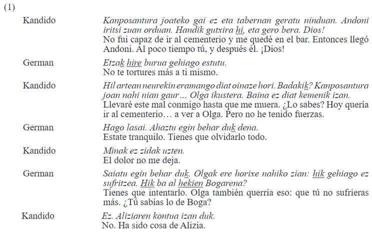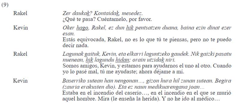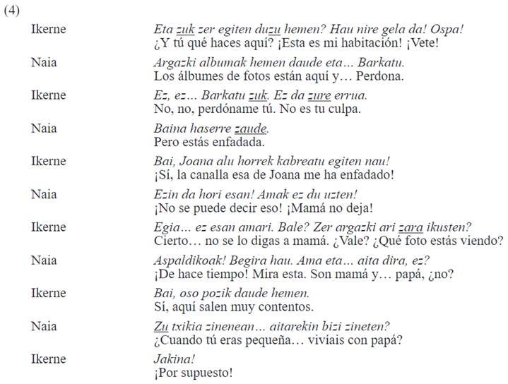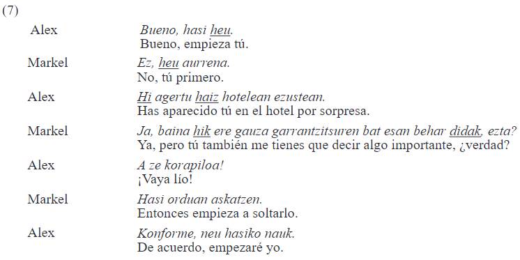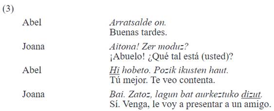 Sin embargo, tal y como se ha mencionado en el párrafo anterior, el uso simétrico de hi solo se produce entre hermanos, ya que cuando existe otro tipo de relación, sobre todo marcada por una diferencia generacional, el uso de los Pro2s no es recíproco. A modo de ejemplo, se ofrece la conversación (2) entre un padre y un hijo, en la que el padre -Abel- se dirige al hijo con hi y el hijo -German- le habla al padre con zu. De forma similar, se observa el mismo patrón, como en el caso de un abuelo y su nieto. La diferencia de edad, además, afecta a ambos géneros de los hablantes, aunque los casos de asimetría entre una mujer y un hombre, como se muestra en (3), donde Abel es el abuelo y Joana la nieta, son más escasos.