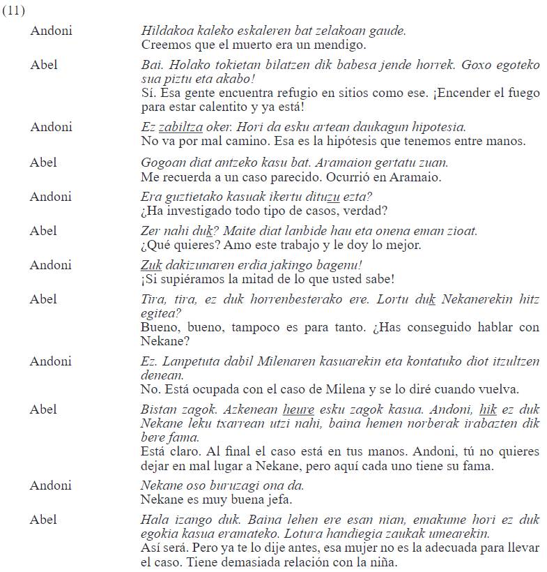 A pesar de todo, también se han encontrado escasos casos en los que dos amigos del mismo sexo usan los Pro2s de manera asimétrica, como se muestra en el extracto (11). La principal razón por la cual los hablantes de la conversación (11) no usan los pronombres de forma simétrica es la diferencia de edad que existe entre los dos: Abel es la persona mayor y es por eso que se dirige a Andoni, el más joven, con hi, mientras que Andoni se refiere a Abel con zu.