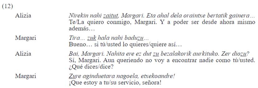 En cuanto a las interacciones marcadas por una relación de distancia social y poder, se ha encontrado que todos los hablantes hacen uso del pronombre zu de manera simétrica, tal y como es el caso de (12), una conversación entre una camarera -Margari- y su jefa -Alizia-; y en (13) entre una empleada -Enriketa- y su jefe -German-. No obstante, cabe mencionar que también se han encontrado dos conversaciones en las que se presenta un uso asimétrico de los Pro2s, ambas entre dos hombres jóvenes, consideradas como excepciones.