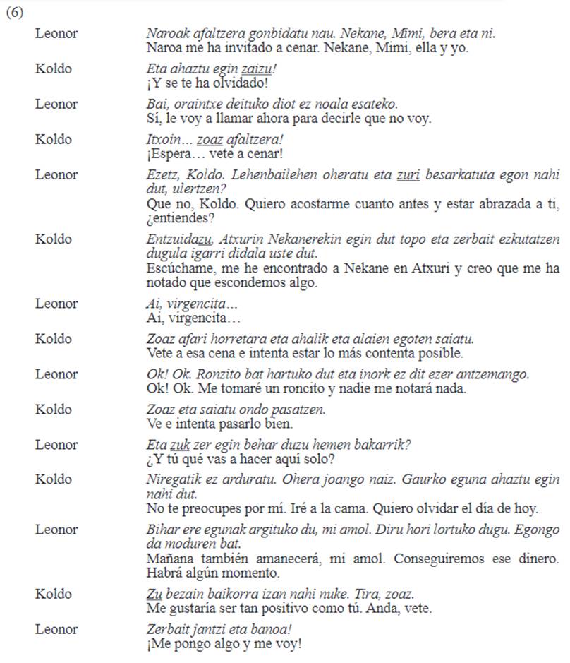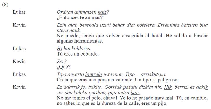 El resto de las conversaciones familiares están marcadas por el uso simétrico de zu, tal y como se mencionó y se ilustra en (4), que consiste en una conversación entre dos hermanas. Es destacable que entre algunos hablantes familiares se ha encontrado el uso recíproco de zu, cuando lo esperado era un uso asimétrico, por ejemplo, entre padres e hijos, porque los personajes del caso (5) utilizan hi en otros ámbitos conversacionales. Esto es lo que ocurre en la conversación (5) entre un padre (Unai) y su hijo (Lukas).