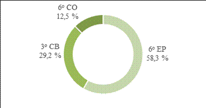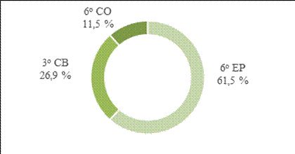 Un sustantivo deverbal o deadjetival opera como predicador semántico si participa de estructuras en las que converge con un verbo que solo porta información morfológica y predica sintácticamente. Entre la variante completa y parcial se contaron 26 ocurrencias de este tipo de predicación nominal: el 61,5 % -16 casos- corresponde a 6o año CO; el 26,9 % -7 casos- a 3er año CB; y el 11,5 % -3 casos- a 6o grado EP. Se representan estas proporciones en el Gráfico 3:
