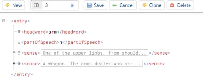 Aunque los programas de edición XML son eficientes y populares, no necesariamente pueden cumplir con todas las necesidades de un proyecto lexicográfico complejo ni fueron diseñados para la labor lexicográfica (Atkins & Rundell, 2008; Abel, 2012). De ahí que los editores puedan cometer errores fácilmente y que, en algunos casos, sea necesario que tengan conocimientos básicos de programación, pues los sistemas no tienen interfaces amigables. Los DWS buscan solventar esta problemática, ya que cuentan con una interfaz de edición sobre la que trabajan los editores sin tener contacto directo con la base de datos. En este caso, el sistema se encarga de que la información que se ingresa en la interfaz de edición quede almacenada y organizada automáticamente en la base de datos.