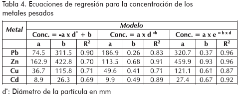 Se realizaron análisis de regresión para todas las concentraciones en función del diámetro de las partículas (Tabla 5). Diferentes modelos de regresión fueron probados y la función exponencial es la que mejores resultados produjo para la mayoría de los metales (R2 ≥ 0.87). La concentración tiende a ser inversamente proporcional al diámetro de la partícula, lo cual es verdadero si se asume que está relacionada con la superficie específica y que las partículas del sedimento recolectado son esféricas. En la práctica, asumir que las partículas son esféricas y que la concentración es inversamente proporcional al diámetro, es una buena aproximación de la realidad (Sansalone y Tribouillard, 1999).