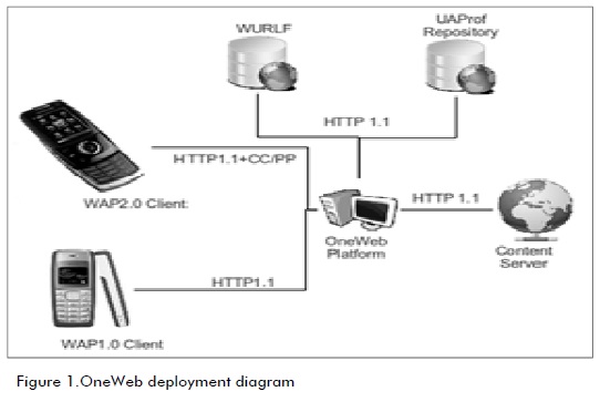 OneWeb is a W3C MWI-based Web content adaptation platform for mobile devices. Figure 1 shows a OneWeb deployment diagram. WAP 1.0 and WAP 2.0 clients send HTTP requests to the OneWeb platform. WAP 2.0 clients add a description of its CCPP delivery context information; OneWeb gets all required information from WURLF and UAProf repositories from previous delivery context data. Once delivery context is complete, the HTTP request is sent to a Web content server; the server response is stored on the platform and adapted according to delivery context data and MWI guidelines. Adapted content is delivered to a client. Although the process is similar for WAP 1.0 clients, context delivery information frequently cannot be extracted from UAProf, and the WURLF repository must therefore be used. WML mark up is used for these clients.
