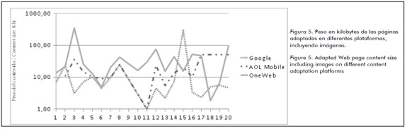 Figure 5 gives a graphical comparison between OneWeb, Google (Google, 2008) and AOL Mobile (AOL, 2008) platform adapted content size in kilobytes; Google and AOL Mobile platforms were selected from a previous comparison analysis with other content adaptation platforms where they gave the best results. However, none of them supported MWI guidelines. A dot over the "x" axis thus meant the content could not be adapted, such as 9, 10, 18 and 19 cases for AOL platform and 9 and 10 cases for Google. Although page 19 was processed by Google Mobile, it could not be used because image map adaptation using MWI guidelines was not enough. Some images could not be adapted by the Google and AOL platforms which reduced page size; however, these results were very close to OneWeb platform behaviour in the same cases.