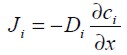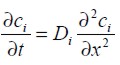 The relationship between flux Ji and concentration ci in a solution is known as Fick' s first law of steady state diffusion (equation 1). Di is the diffusion coefficient, ci is the ion concentration and x is the distance. For non-steady state conditions, when concentrations are changing t, flux is defined by Fick' s second law (equation 2).
