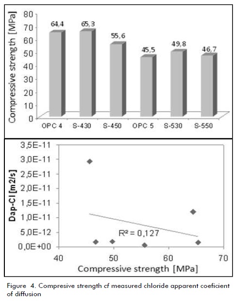Figure 4 (left-hand side) shows the results for compressive strength for all mixtures tested. It may be noted that maximum strength was reached when slag replacement was 30% for both water to binder ratios. Although there were no significant increases in strength, the values obtained did not decrease, thus indicating that blast furnace slag blends can be used as structural material in similar conditions to Portland cement. Figure 4 (righthand side) shows that there was no clear relationship between compressive strength and diffusion coefficient. This result was significant because compressive strength is the most popular test in concrete technology and tends to be used as correlation for estimating other properties.
