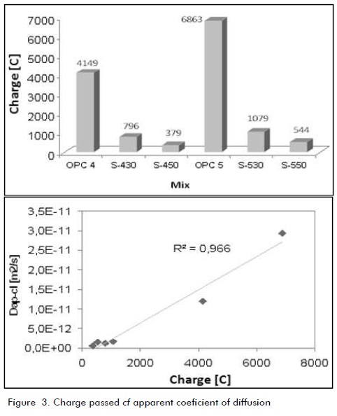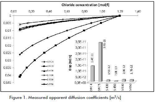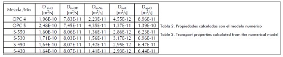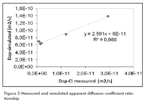Figure 5 shows the relationship between apparent diffusion coefficient measured and calculated; it can be observed that the parameters had good correlation. The determination coefficient R2 obtained was 0.986, which showed linear dependence between these variables. The differences between the numerical values were due to the basic equations used to calculate the coefficients. Fick' s second law was used for diffusion and the Nearnst Planck equation was used for electromigration coupled to diffusion.