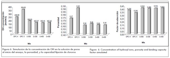 The initial hydroxyl ion concentration, porosity and binding capacity factor for chlorides are shown in Figure 6. It can be observed that alkalinity, measured as OH- ion concentration, decreased as the percentage of slag replacement increased. This was because the alkalis (Na+ and K+) in slag pore solution were consumed by complex hydration reactions resulting in decreased pH. This decrease affected pore solution conductivity and mobile species' diffusion-migration due to changes in ion potential. The numerical results for the OH- concentration generally agreed with results published previously by Bertolini et al., (2004).
