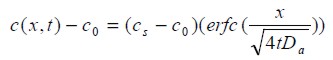 Assuming an ideal situation in which only chloride ions diffuse in homogeneous semi-infinite media, influenced by a constant concentration gradient, an approximate solution of Fick' s second law can be obtained by using equation 3 (Crank, 1976). In this, c (x, t) is defined as chloride concentration for any time and position, co is the initial concentration of chlorides in the pore solution, cs is a constant concentration on the external surface, Da gives the apparent diffusion coefficient and ercf is the Gaussian error function.