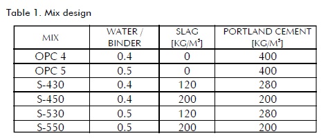 Mixtures of Portland cement and blast furnace slag were prepared at constant 0.4 and 0.5 water to cement ratios. For all mixtures, 400 kg of cementitious material was used per cubic meter of concrete. The replacement levels were 30% and 50% slag. Table 1 shows the mix designs developed and the corresponding nomenclature used in this research. All tests were conducted at ages beyond 120 days, with curing in water tanks.