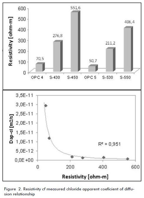 The electrical resistivity of the samples tested is shown in Figure 2 (left-hand side). It was observed that as percentage addition increased, resistivity also increased for both water to cement ratios, this being highest for 50% replacement. The relationship between resistivity and diffusion coefficient is shown in Figure 2 (right-hand side); this shows that data was exponential; "large" increases in resistivity for blended samples yielded to "small" changes in the diffusion coefficient, while for samples without addition, "small" increases in resistivity produced "large" increases in the diffusion coefficients. The increase in resistivity for mixtures using slag increased resistance to corrosion of reinforcement, as has been reported by Song and Saraswathy (2006).