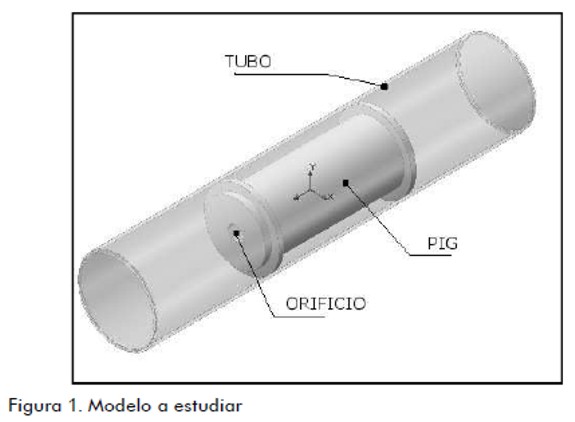 El modelo estudiado está formado por un segmento de tubo y el PIG (figura 1 ). El tubo es cilíndrico, recto y horizontal. El diámetro nominal escogido en el proyecto es de 12 pulgadas, que corresponde a un tubo de diámetro interno de 304,8 mm y externo de 323,85 mm; la longitud es de 4 m y la rugosidad interna de 25 micrómetros típica para ductos de acero nuevos (Stukenbruck, 2008).