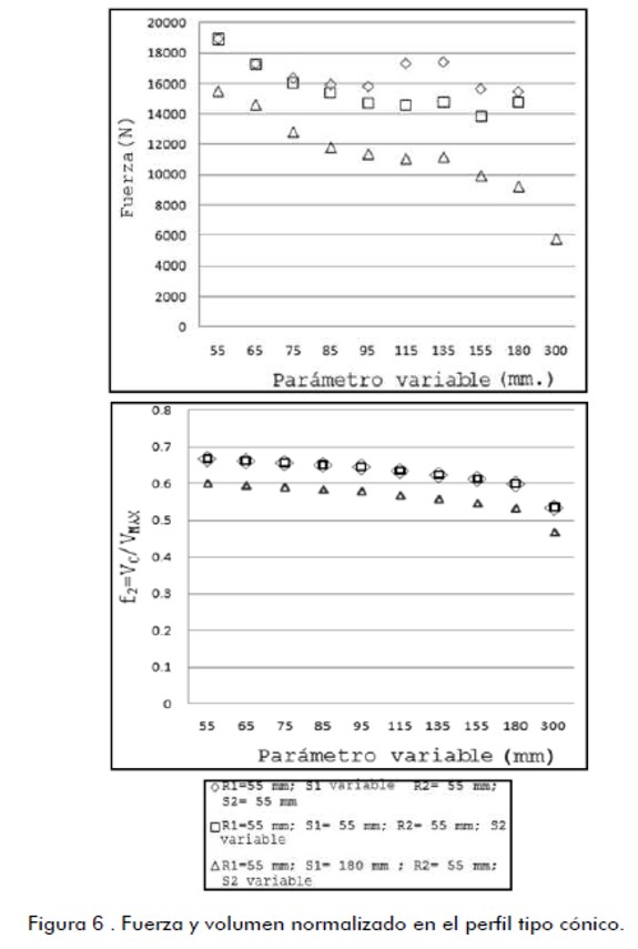 Los resultados de fuerza para el perfil tipo polinómico son presentados en la figura 8. El número de perfiles posibles es mayor por la dependencia de seis parámetros. A los objetos de obtener los perfiles con la menor fuerza fue llevado a cabo un proceso tipo algoritmo genético. Se generaron de forma aleatoria conjuntos de valores r2, s1 e i2 (figura 5(c)) y con cada conjunto fue calculado y construido el correspondiente perfil. El cálculo de fuerza fue hecho para este conjunto de perfiles. Los perfiles correspondientes a los casos con fuerza menor, fueron seleccionados y los parámetros de estos perfiles se cruzaron para generar una segunda generación de perfiles. Nuevamente se hicieron corridas de software para calcular las fuerzas.