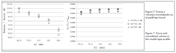 Los resultados de fuerza y de la función de volumen normalizado para el perfil tipo bocal son presentados en la figura 7.