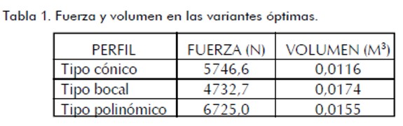 Para cada uno de los perfiles fue aplicado un proceso de optimización multiobjetivo similar al descrito para la obtención del diámetro de orificio óptimo. Así, en cada conjunto de variantes fue seleccionada una como la variante óptima de cada tipo de perfil que minimiza la fuerza y maximiza el volumen. El valor para el criterio de diseño tomado es: C1 = 0,5.