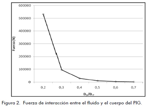 El diámetro del orificio (DO) se varía de 10% a 70 % del diámetro interno del tubo (DIT) en pasos de 10%. La fuerza (F) que ejerce el fluido sobre el cuerpo del PIG en la dirección de desplazamiento se evalúa para cada caso utilizando una herramienta de dinámica computacional de fluidos (CFD). El resultado de la fuerza como función de la relación DO/DIT es presentado en la figura 2 .