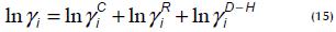 Con estas metodologías el coeficiente de actividad es calculado usando tres términos: uno de combinación (ln yiC), el cual considera la forma y tamaño de cada grupo; otro residual (ln yiR), que suma las interacciones estéricas entre todos los grupos presentes en el líquido; y para el caso de la solución salina, en la ecuación 15 se adiciona un término (ln yiDH) que representa el efecto de las interacciones electrostáticas o teoría Debye-Huckel (Correa et al., 1997).