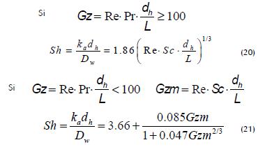 Al tratarse de módulos de fibras huecas pueden aplicarse modelos semiempíricos para predecir el coeficiente ka, para lo cual el flujo de la alimentación dentro de la fibra puede asimilarse al que se presenta en una tubería. Por tal razón, la ecuación de Sieder-Tate y sus análogas para transferencia de masa - ecuaciones (20) y (21)- pueden ser aplicadas satisfactoriamente (Martínez-Díez et al., 2000).
