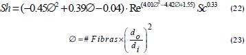 Se han realizado varios estudios para generar modelos con la finalidad de estimar el coeficiente (kp) por fuera de los fibras huecas -lado de la carcasa- (Wu et al., 2000; Gawronski, 2000; Lipnizki, 2001). Recientemente Thanedgunbaworn y cols. (2007b) desarrollaron una nueva expresión (22), con la cual lograron una mejor descripción del fenómeno, encontrando que el número de Reynolds es una función de la densidad de empaquetamiento ( Ø ).