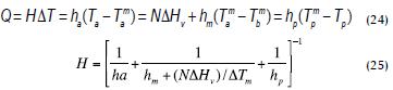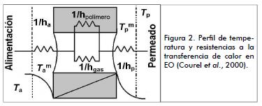 El proceso de EO es considerado isotérmico siempre que no exista una diferencia de temperatura a través de la membrana. No obstante, debido al calor latente del cambio de fase ocurrido en las paredes la evaporación genera un ligero enfriamiento en la alimentación y la condensación calienta la salmuera, con lo cual la transferencia de masa está asociada con la de calor; esta diferencia de temperatura resultante se convierte en un decaimiento del gradiente de presión de vapor, con la consiguiente disminución de la fuerza impulsora (Courel et al., 2000). La figura 2 muestra el mecanismo de transferencia de calor como un conjunto de resistencias y un perfil de temperaturas bajo condiciones medias; las expresiones (24) y (25) representan el balance de calor en los diferentes compartimentos del sistema y el coeficiente total, respectivamente.