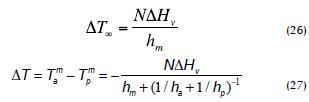 ), por tal motivo las membranas deben ser tan conductivas como sea posible. El efecto de ΔT∞ en la fuerza impulsora para el transporte de agua puede ser evaluado por la ecuación de Clausius-Klapeyron; la importancia de encontrar ΔT radica en que bajo esas condiciones de operación no se presentará flujo de calor a través del sistema (Gostoli, 1999). Cuando las temperaturas son controladas y mantenidas constantes en ambos líquidos, la diferencia de temperatura transmembrana ΔT está dada por la ecuación 27.