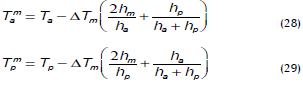 Para especificar las temperaturas en las interfaces de los líquidos y la superficie de la membrana es necesario modificar la ecuación 27, obteniéndose dos expresiones (28) y (29) que permiten calcular dichas temperaturas (Bui et al., 2005b; McCutcheon et al., 2008).