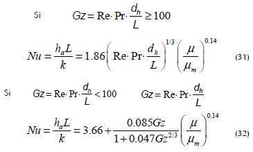El coeficiente de transferencia convectivo (ha) al interior de membranas huecas puede cuantificarse mediante analogía con el flujo dentro de una tubería aplicándose los modelos de Sieder-Tate y Hausen que se definen según las ecuaciones (31) y (32), las cuales hacen uso del número de Nusselt para el cálculo de este parámetro (Martínez-Díez et al., 2000).